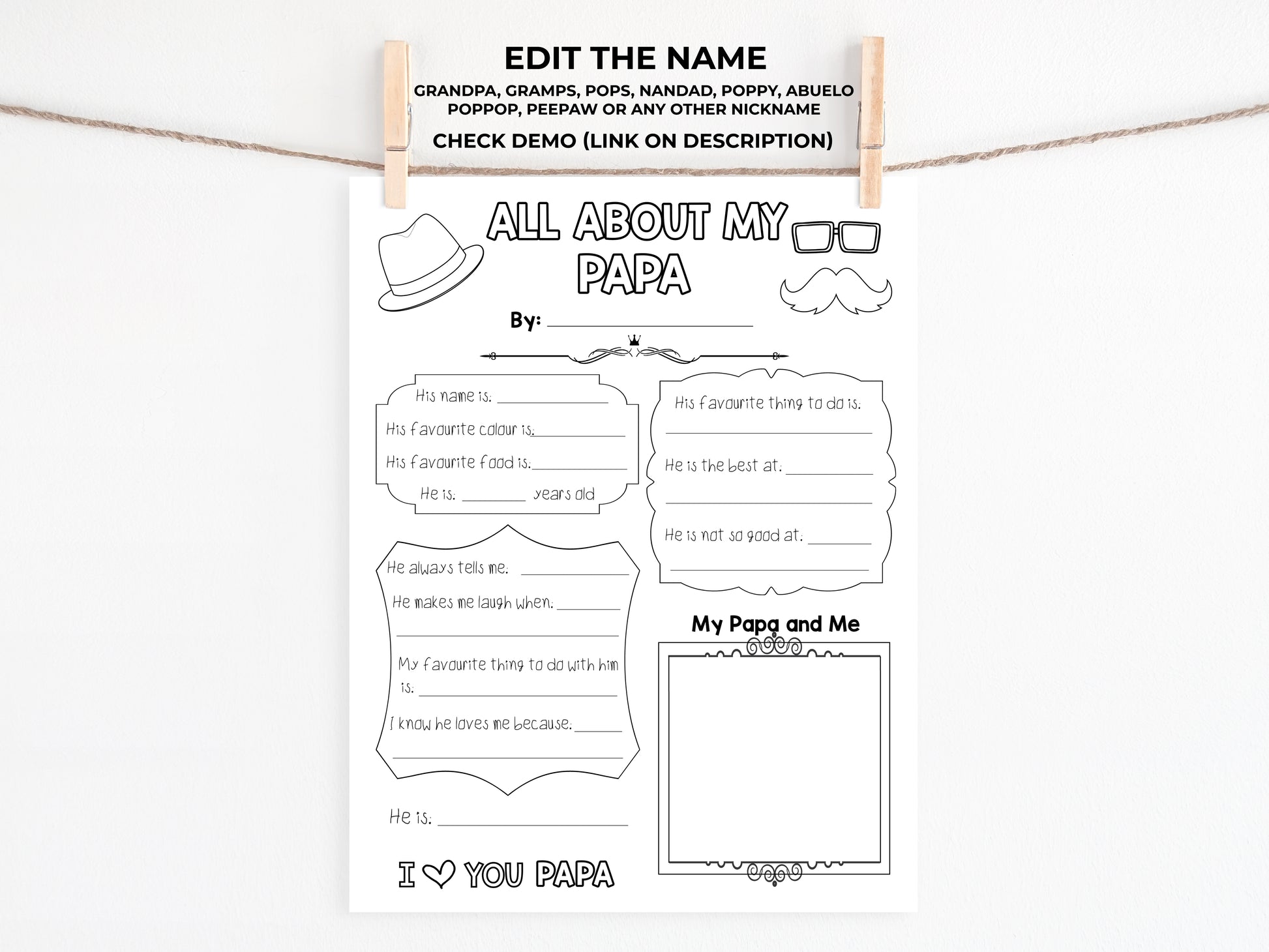 All About my Grandfather Printable - UK version (favourite) - Father's Day gift - DIY Instant Digital Download Personalize it - Father's Day Activity - About My Grandpa Pops Printable Kid Gift