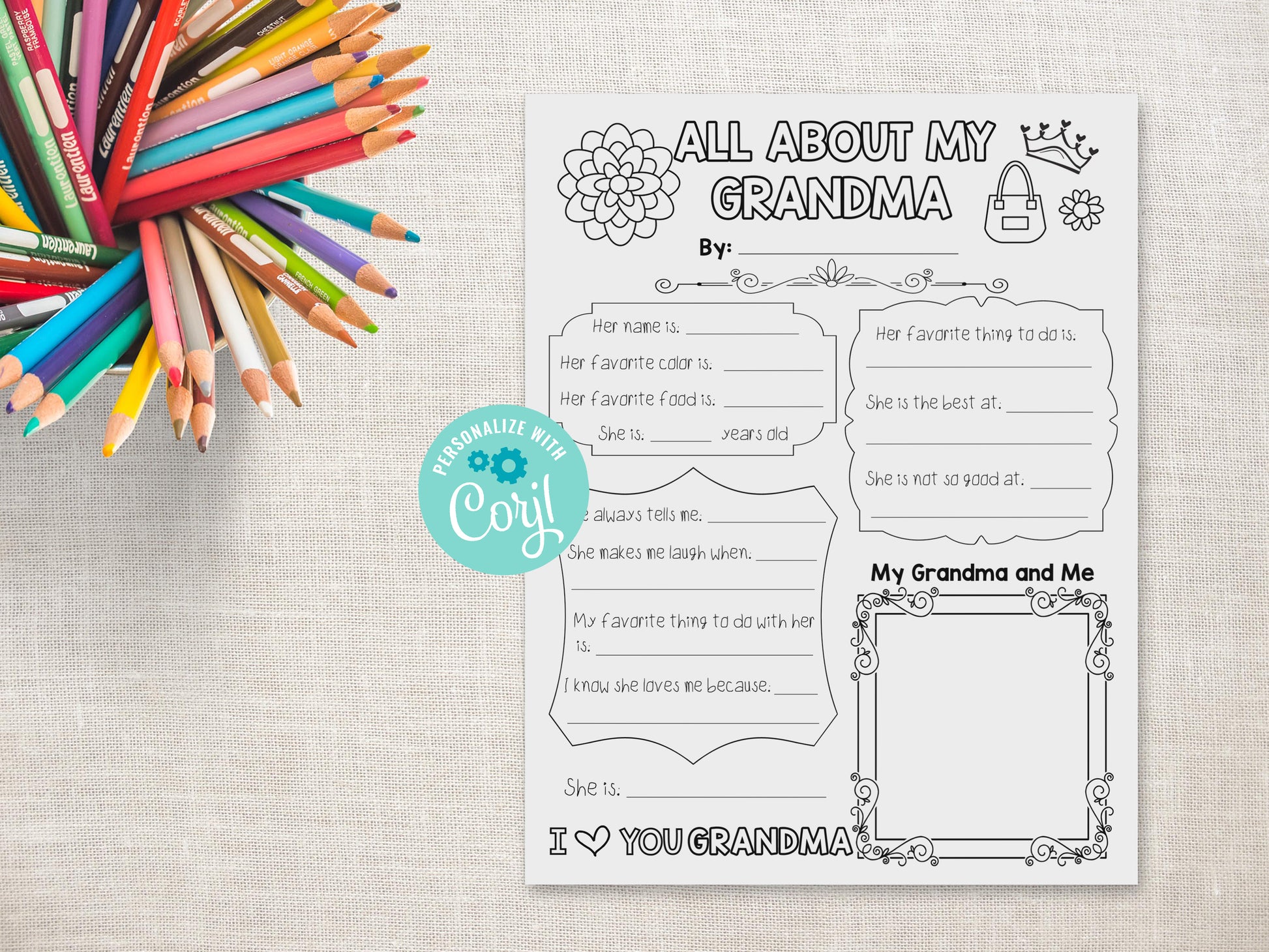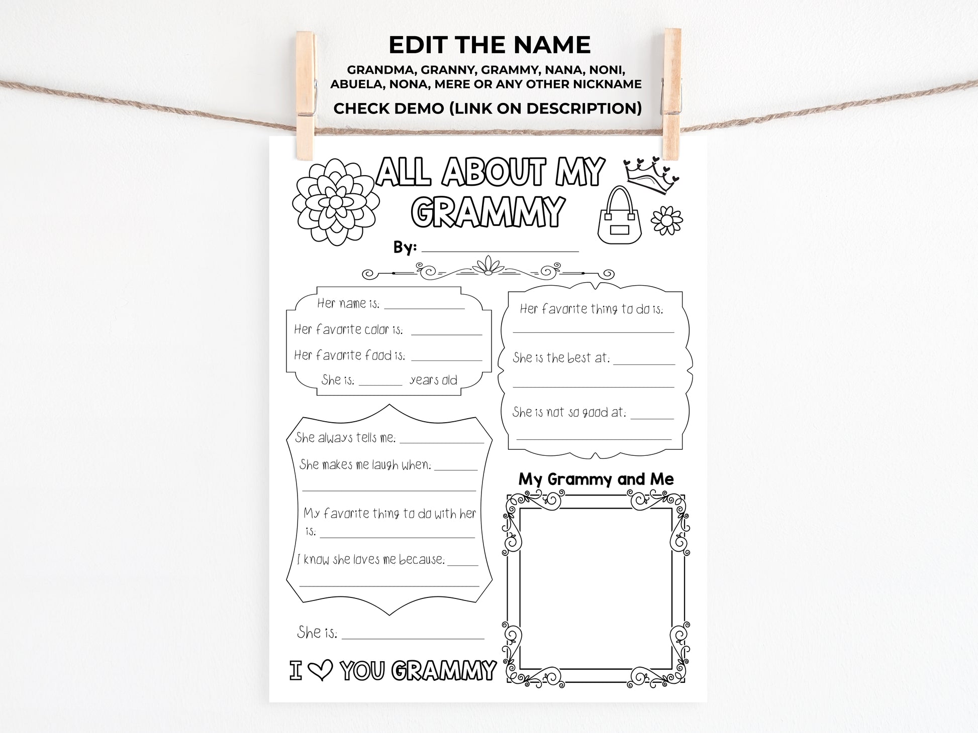 All About my Grandma Printable - Grandmother gift - Mother's Day Activity Kid Gift - Granny, Grammy, Nana, Abuela, Noni, Nona, Mere - Mother's Day gift - DIY Instant Digital Download Personalize it
