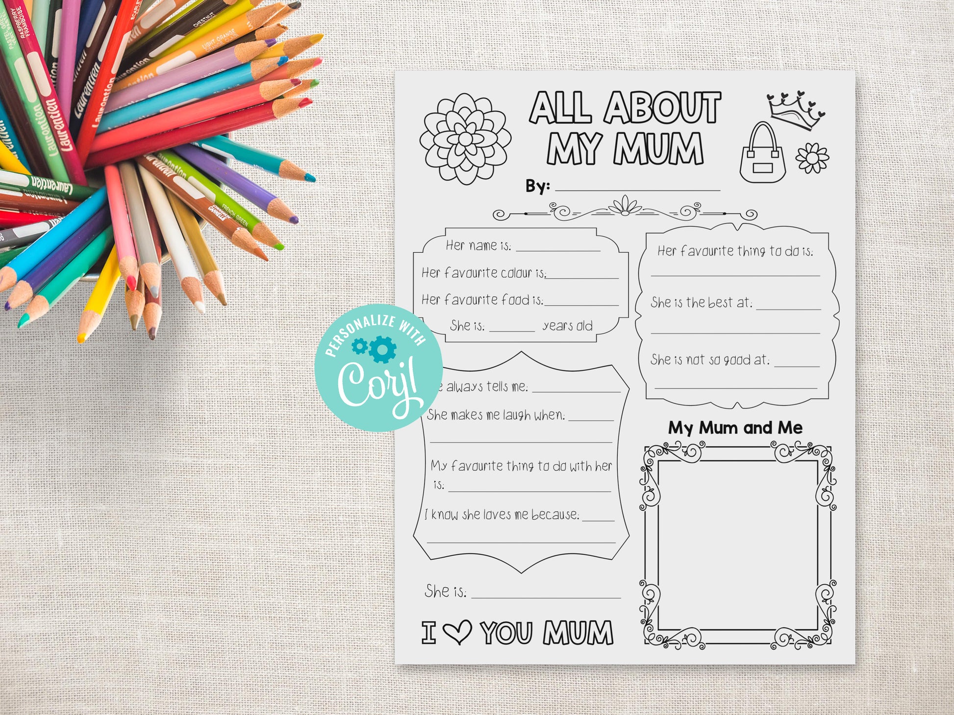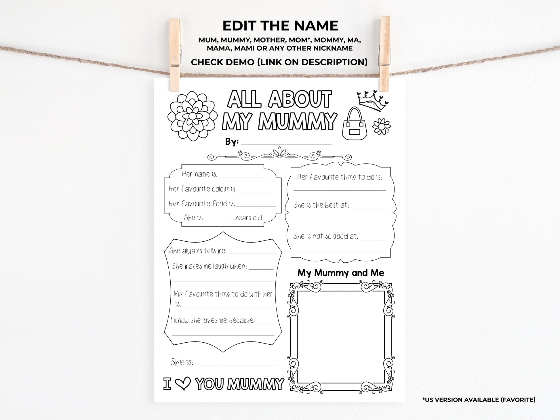 All About my Mum Printable - Mother's Day gift - DIY Instant Digital Download Personalize it - Mother's Day Activity Kid Gift - All About my Mummy - UK version (favourite)