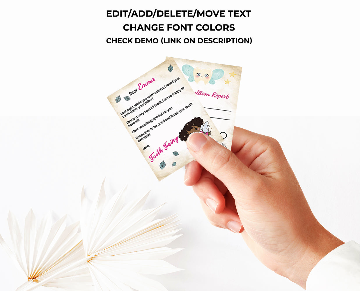 This listing includes 1 file: a US letter size page (8.5 x 11 inches) that includes one mini letter from the Tooth Fairy, one Tooth Condition Report and one envelope.