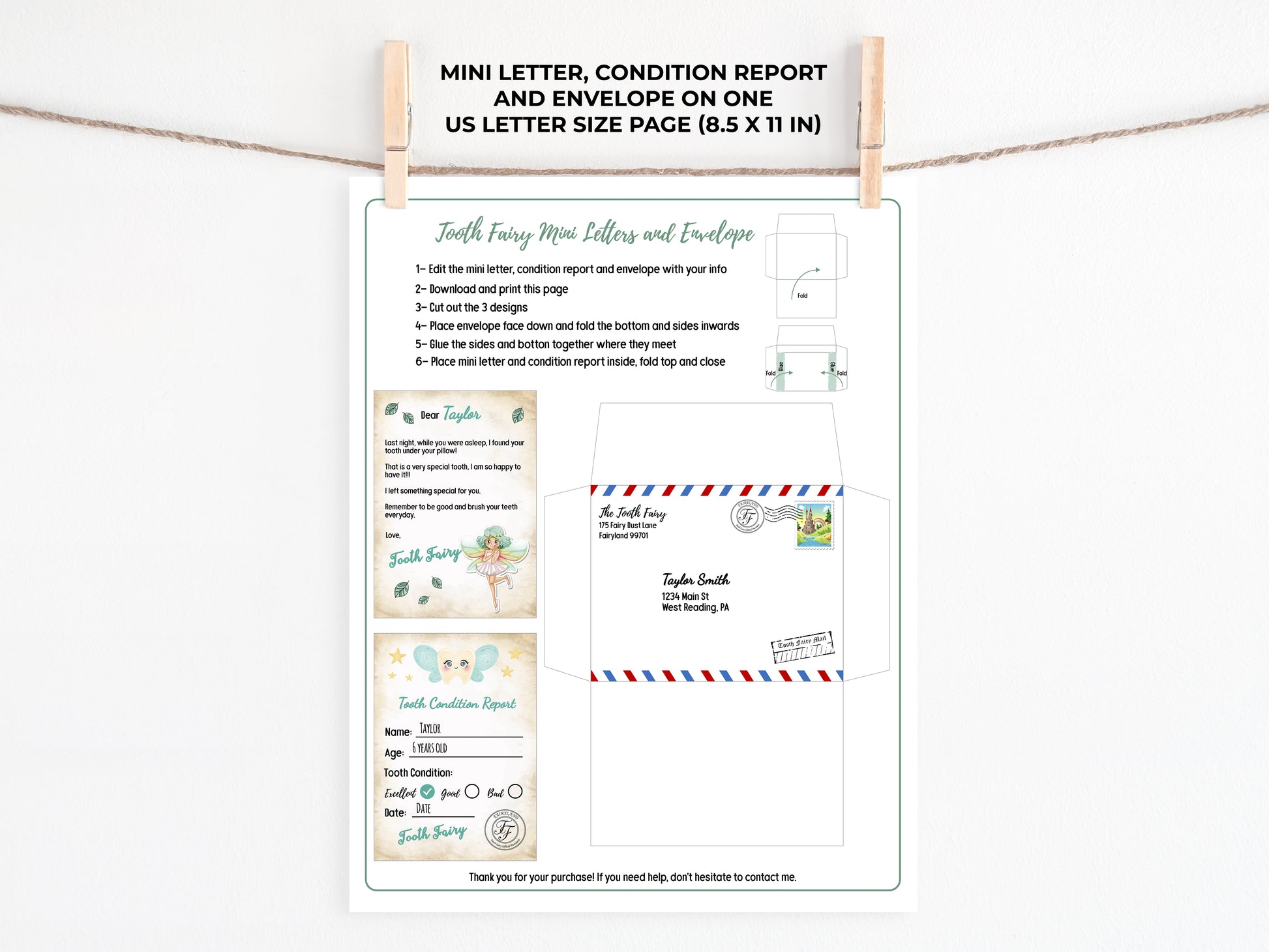 This listing includes 1 file: a US letter size page (8.5 x 11 inches) that includes one mini letter from the Tooth Fairy, one Tooth Condition Report and one envelope.