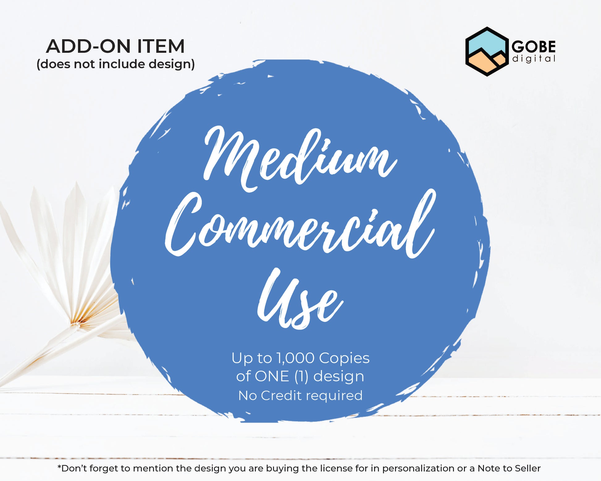 This license is for the medium commercial use (up to 1,000 units) of one of our designs with no credit given back to Gobe Designs. If you will produce more than 1,000 copies, please purchase an Extended Commercial Use License (up to 10,000 units) instead.