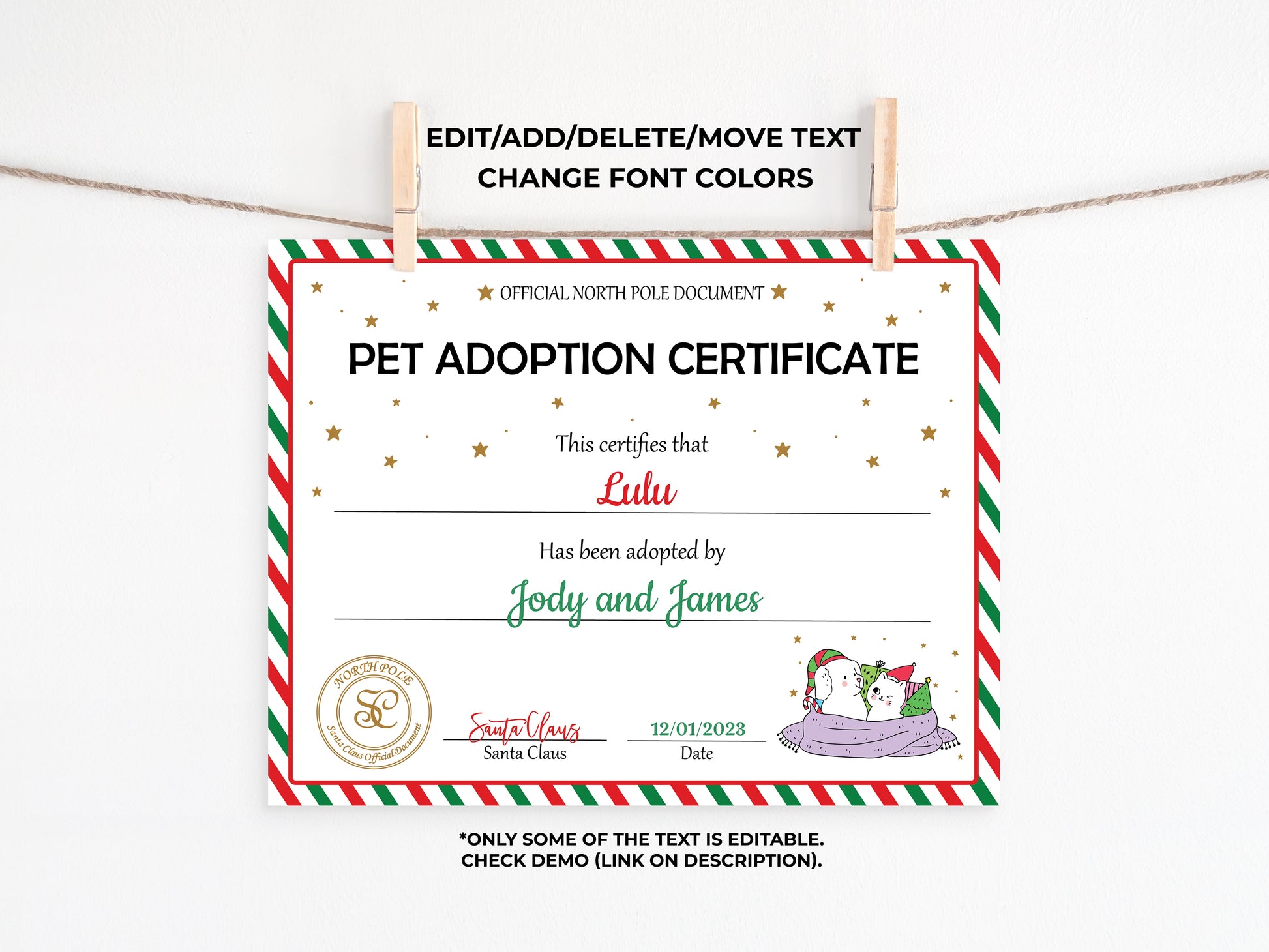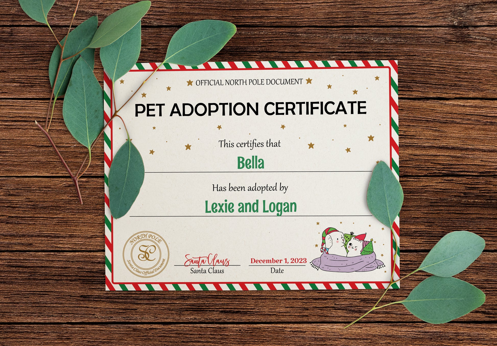 Adopt a Pet on Christmas. Adopt a real pet or a plush toy. Pet Adoption Certificate.