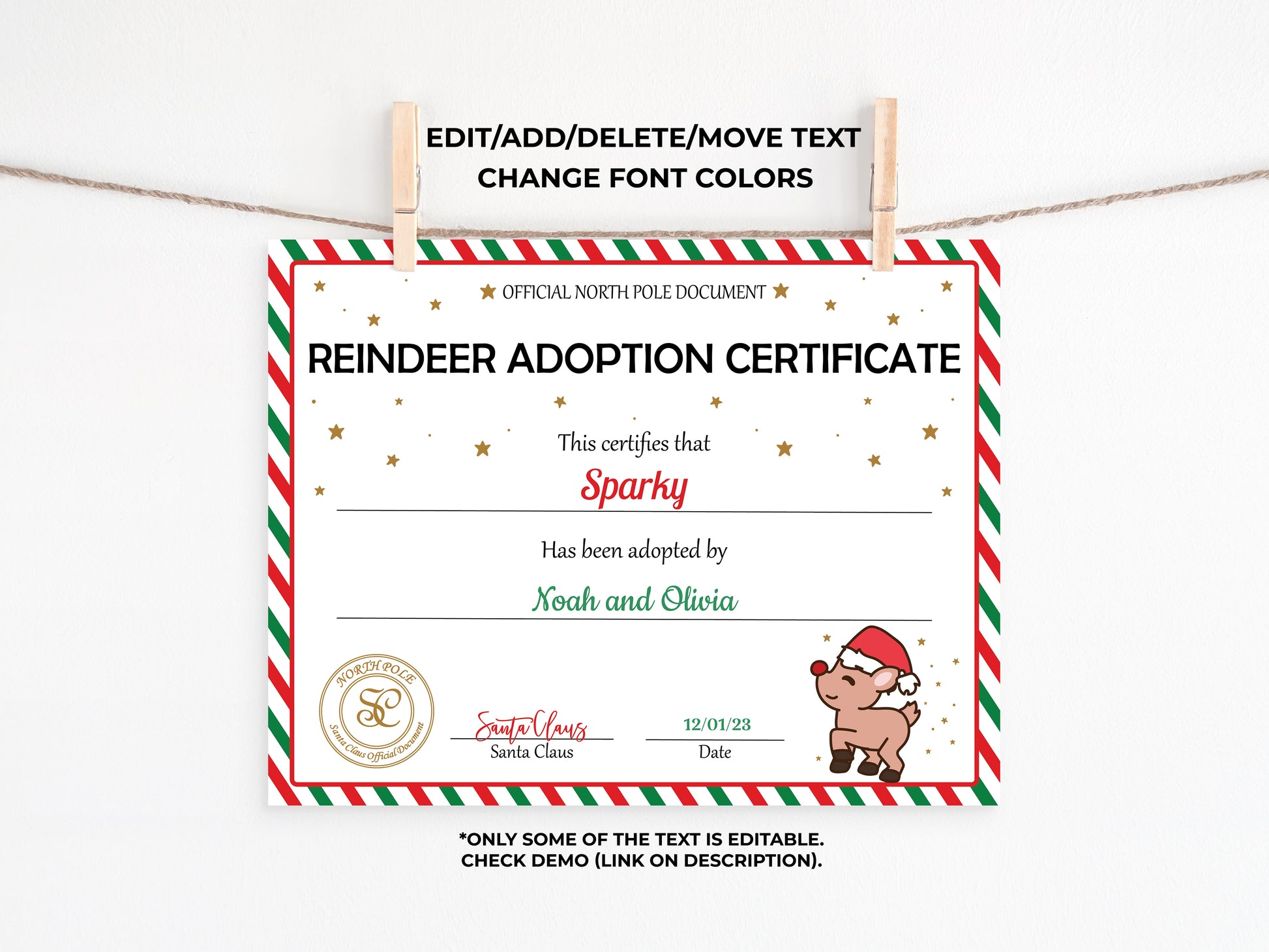 Adopt a Reindeer. Pet Adoption Certificate. Reindeer Adoption Certificate